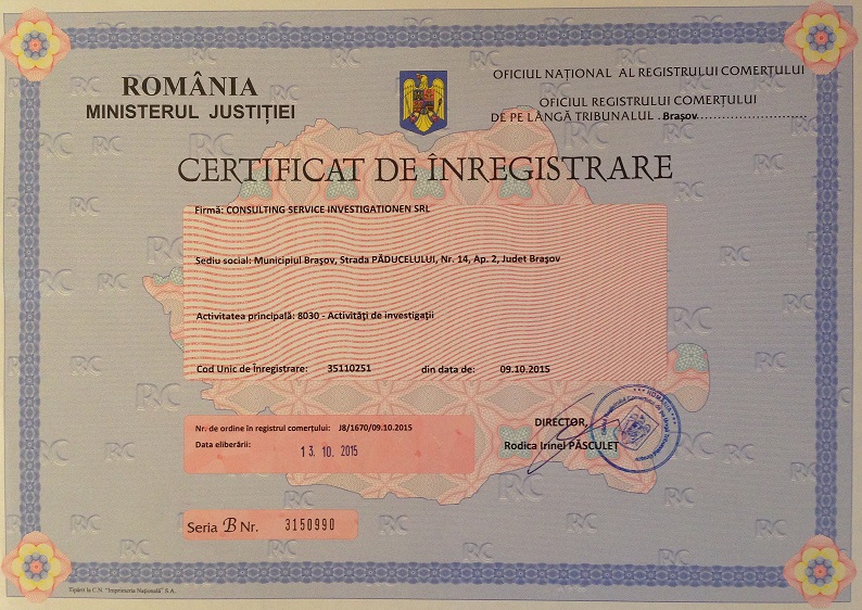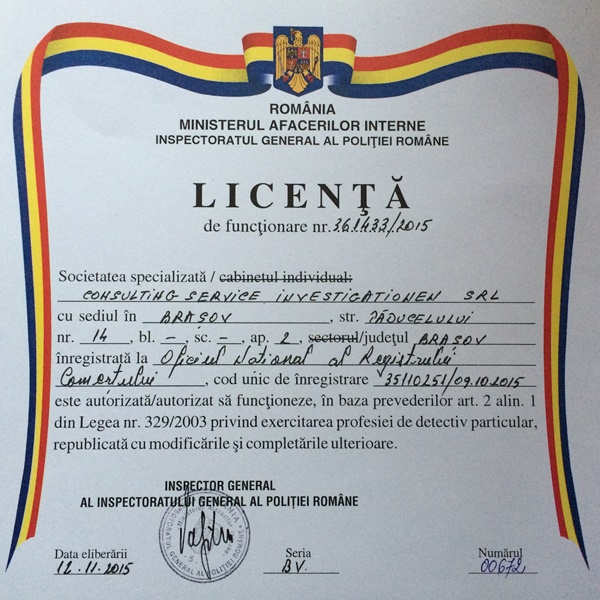Agentia de detectivi si investigatii Consulting Service Investigationen cu sedii in Brasov si Bucuresti s-a constituit ca societate specializata cu unic obiect de activitate, licentiata de catre Inspectoratul General al Politiei Romane destinata special investigatiilor atat pentru persoanele fizice cat si persoanele juridice.